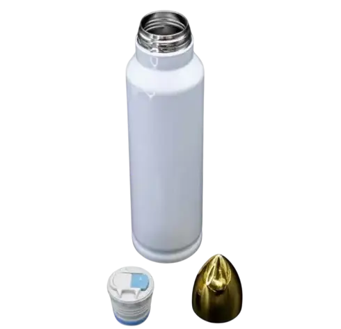 Make a bold statement with our Personalised Bullet Flask, available in 500ml or 1-litre capacity. With a sleek white and gold stainless steel design and a matching gold cap, this flask offers both elegance and practicality β perfect for personalised gifts, branding, or your own unique style.
